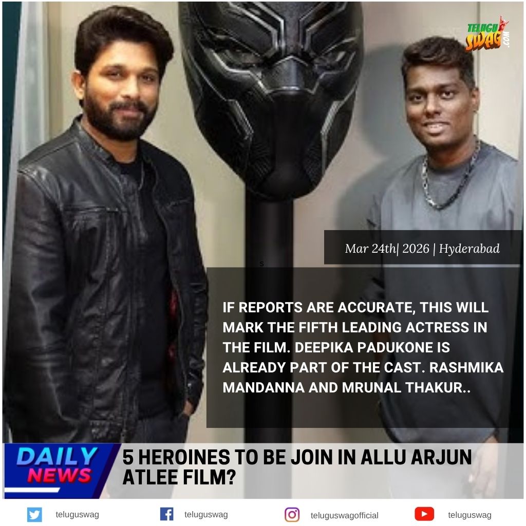 కాన్ స్టార్ అల్లు అర్జున్ మరియు కోలీవుడ్ సెన్సేషనల్ డైరెక్టర్ అట్లీ కాంబినేషన్‌లో రాబోతున్న ప్రాజెక్టు ప్రస్తుతం భారతీయ సినీ పరిశ్రమలో హాట్ టాపిక్‌గా మారింది. పుష్ప చిత్రంతో గ్లోబల్ స్థాయిలో గుర్తింపు తెచ్చుకున్న అల్లు అర్జున్, ఇప్పుడు దర్శకుడు అట్లీతో కలిసి ఒక భారీ పాన్ ఇండియా యాక్షన్ ఎంటర్టైనర్‌ను సిద్ధం చేస్తున్నారు. ఈ సినిమా గురించి వినిపిస్తున్న అత్యంత ఆసక్తికరమైన అంశం ఏమిటంటే, ఇందులో ఏకంగా ఐదుగురు స్టార్ హీరోయిన్లు నటించబోతున్నారట..