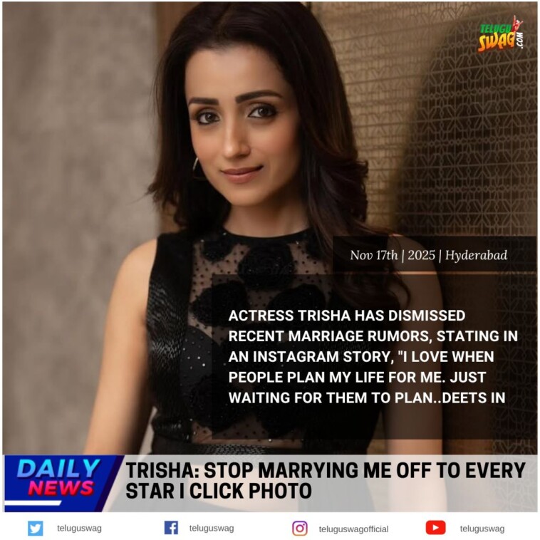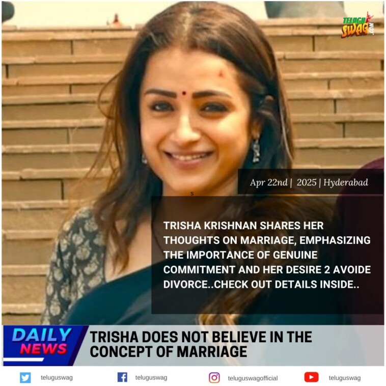 సీనియర్ నటి త్రిష క్రిష్ణన్ పెళ్లి అయినా, కాకపోయినా తనకు ఫరవాలేదని తేల్చి చెప్పారు. ఈ క్రమంలో వివాహ వ్యవస్థపై తనకు నమ్మకం లేదని ఆమె సెన్సేషనల్ కామెంట్స్ చేశారు. కమల్ హాసన్తో కలిసి త్రిష నటించిన తాజా చిత్రం థగ్ లైఫ్. ఈ మూవీ ప్రమోషన్స్లో భాగంగా తాజాగా ఓ ఇంటర్వ్యూలో పాల్గొన్న త్రిషకు పెళ్లిపై ప్రశ్న ఎదురైంది.. దానికి ఆమె ఇలా షాకింగ్ సమాధానం చెప్పారు. మొత్తంగా తనకు పెళ్లిపై సదుద్దేశం లేదని త్రిష [...] -