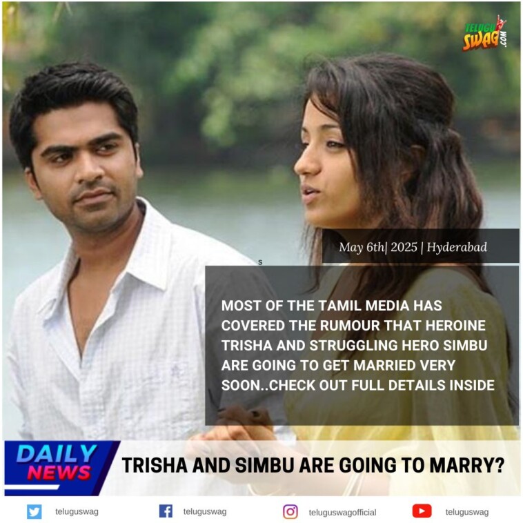 త్రిష, శింబు పెళ్లి వార్త మరోసారి హాట్ టాపిక్గా మారింది. అయితే, ఈ వైరల్ అవుతున్న ఫొటో ఎప్పటిది, ఏ సందర్భంలోనిది అనే స్పష్టత లేదు. శింబు, త్రిష మధ్య మంచి స్నేహం ఉందని కోలీవుడ్ వర్గాల్లో ఎప్పటినుంచో వినిపిస్తున్న మాట. వీరిద్దరూ కలిసి గతంలో 'అలై', 'విన్నైతాండి వరువాయా' వంటి విజయవంతమైన చిత్రాల్లో నటించారు. లాక్డౌన్ సమయంలో ప్రముఖ దర్శకుడు గౌతమ్ మీనన్ రూపొందించిన 'కార్తీక్ డయల్ సైత ఎన్' అనే షార్ట్ ఫిలింలో కూడా [...] -