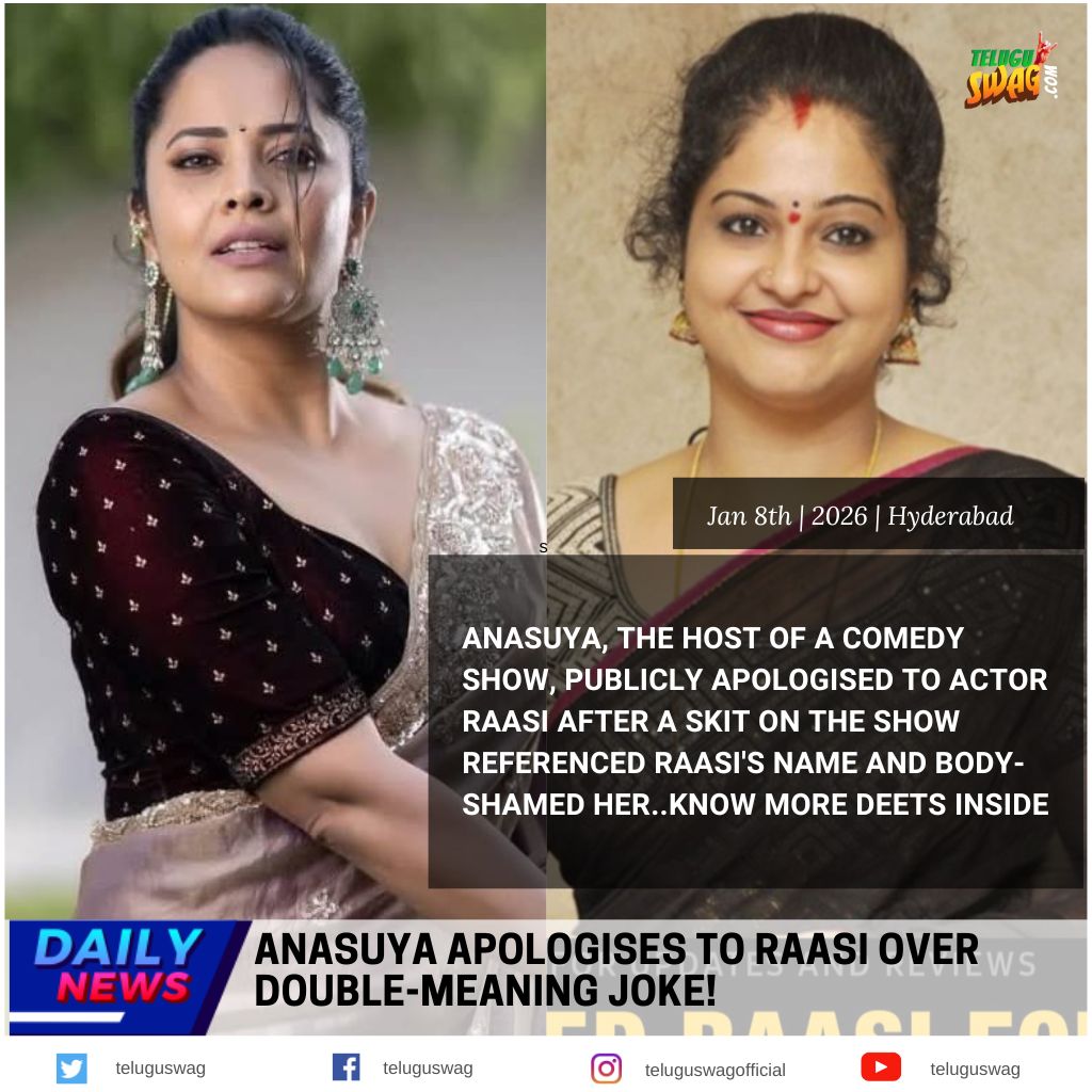 ఈ నేపథ్యంలో రాశికి అనసూయ క్షమాపణలు చెప్పారు. “మూడు సంవత్సరాల క్రితం నేను చేసిన ఒక షోలో తెలుగు సరిగ్గా రానితనంపై చేసిన స్కిట్ లో మీ పేరును ఉపయోగించి నా నోటి నుంచి డబల్ మీనింగ్ డైలాగ్ చెప్పించడం జరిగింది. ఇది రాయించి డైరెక్ట్ చేసిన వ్యక్తుల్ని నేను ఆ రోజే నిలదీసి అడిగి ఉండాల్సింది కానీ అప్పటికి నాకు ఉన్నటువంటి శక్తి అందుకు సహకరించలేదు. అది పొరపాటే..దయచేసి క్షమించండి..!!